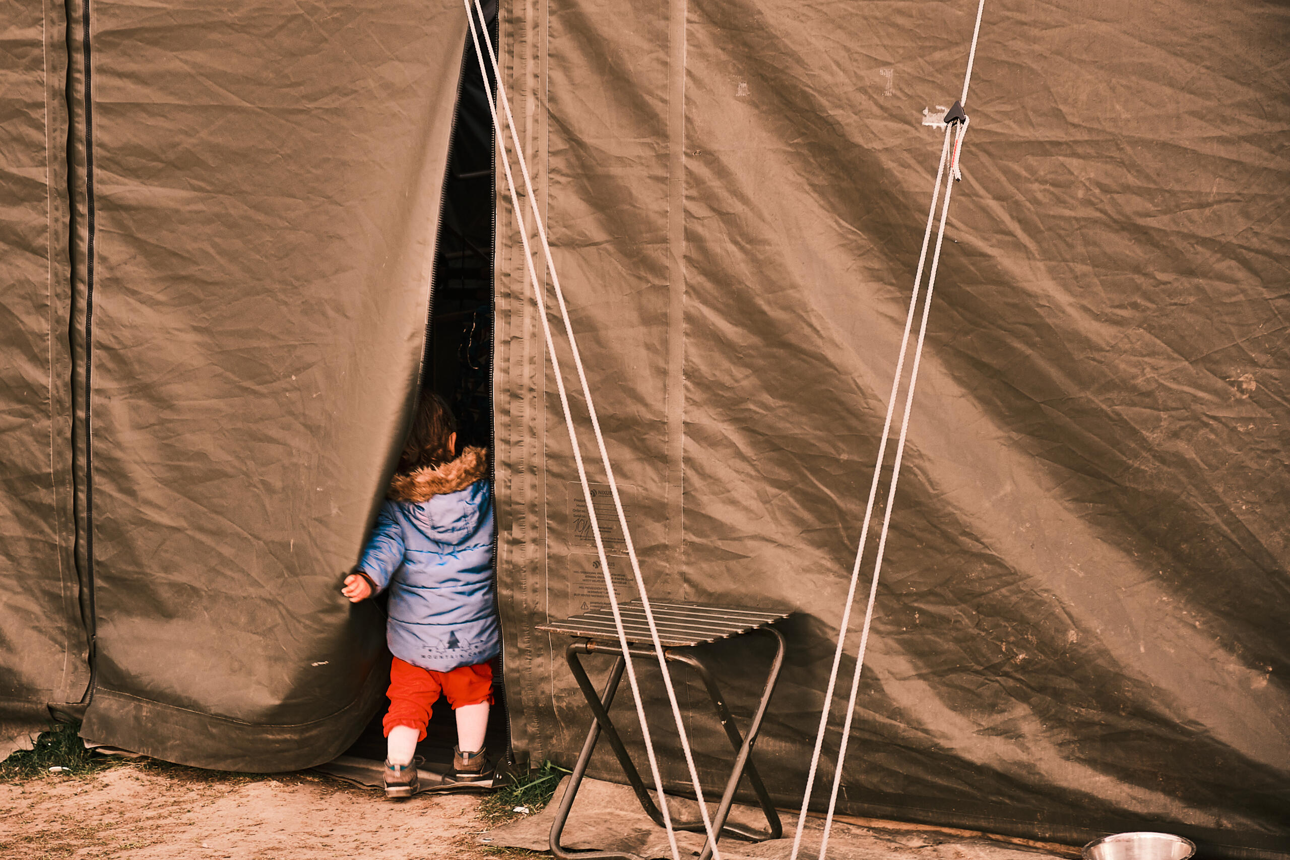 A little girl entering an emergency tent at the border crossing of Vyšné Nemecké, Slovakia.