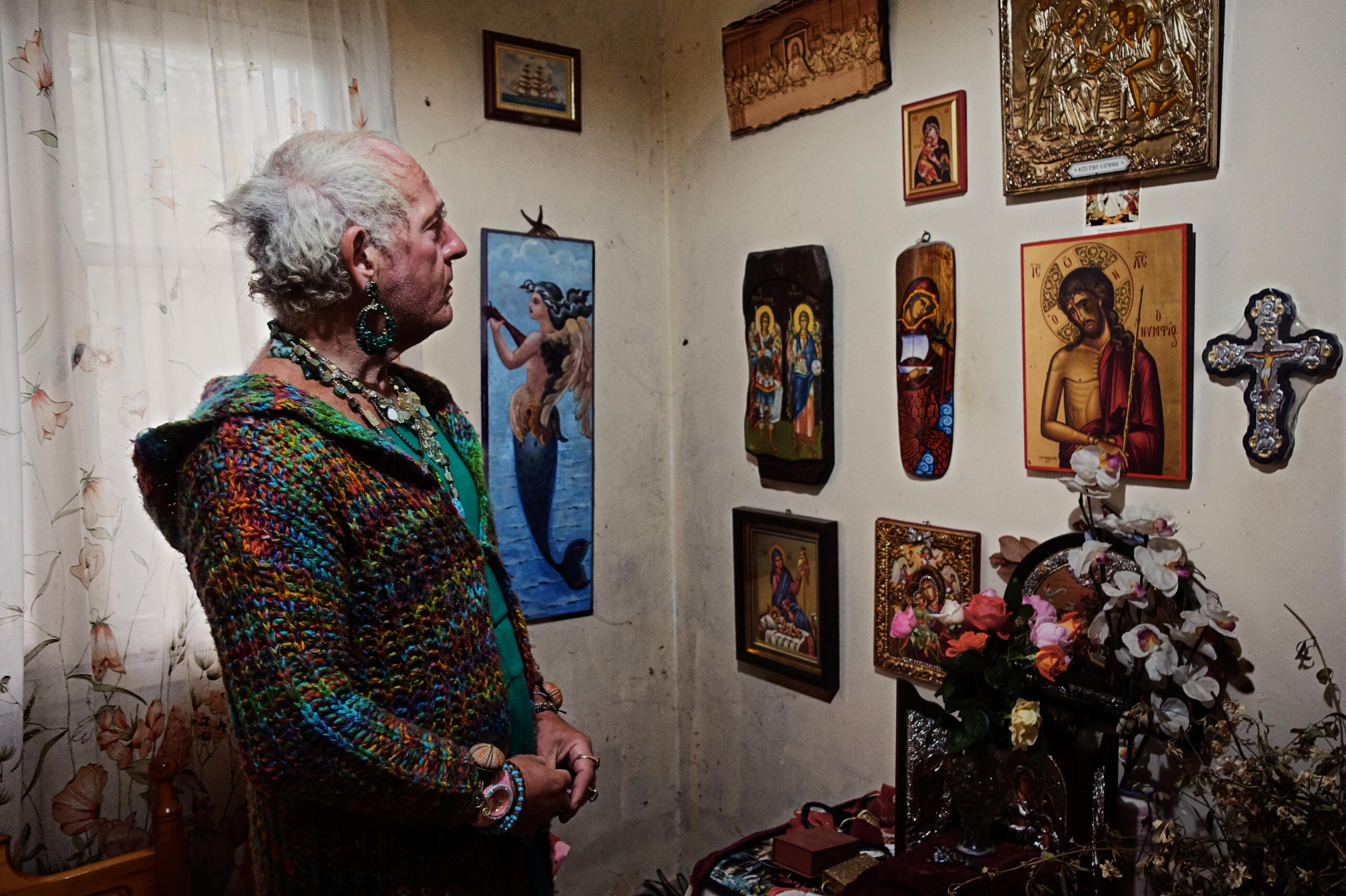 Dimitri was born in the small fishing village of Skála Sikaminéas, on the Greek island of Lesvos, and had to fight for her right to cross the invisible border of gender identity.Ever since telling her parents that she was a girl, at the age of fourteen, she struggled to be accepted. She faced difficult times, living in a mental institution during her childhood, as well as years of homelessness in Athens. After her parents passed away, she began wearing women's clothes and high heels.Dimitri told me that she finally felt comfortable with her identity and appearance. In the little sunny harbour of Skála, she used to walk with her head held high. The walls of her house were covered with religious images, as she was very devout. She loved opera, especially Maria Callas, and often played it loud, filling the calm air of Skála with melancholy.When I asked her why she often seemed sad, she said it was because of all the horrible things happening in the world, and she wasn't just referring to the news. There is in fact another story, hidden in the background, one of displacement. Another invisible border, the one between Turkey and Greece, lies in the waters off Skála Sikaminéas. Thousands of people risk their life to cross it every year, fleeing conflict, persecution or hardship, and many land on these very shores, which Dimitri could witness first-hand.